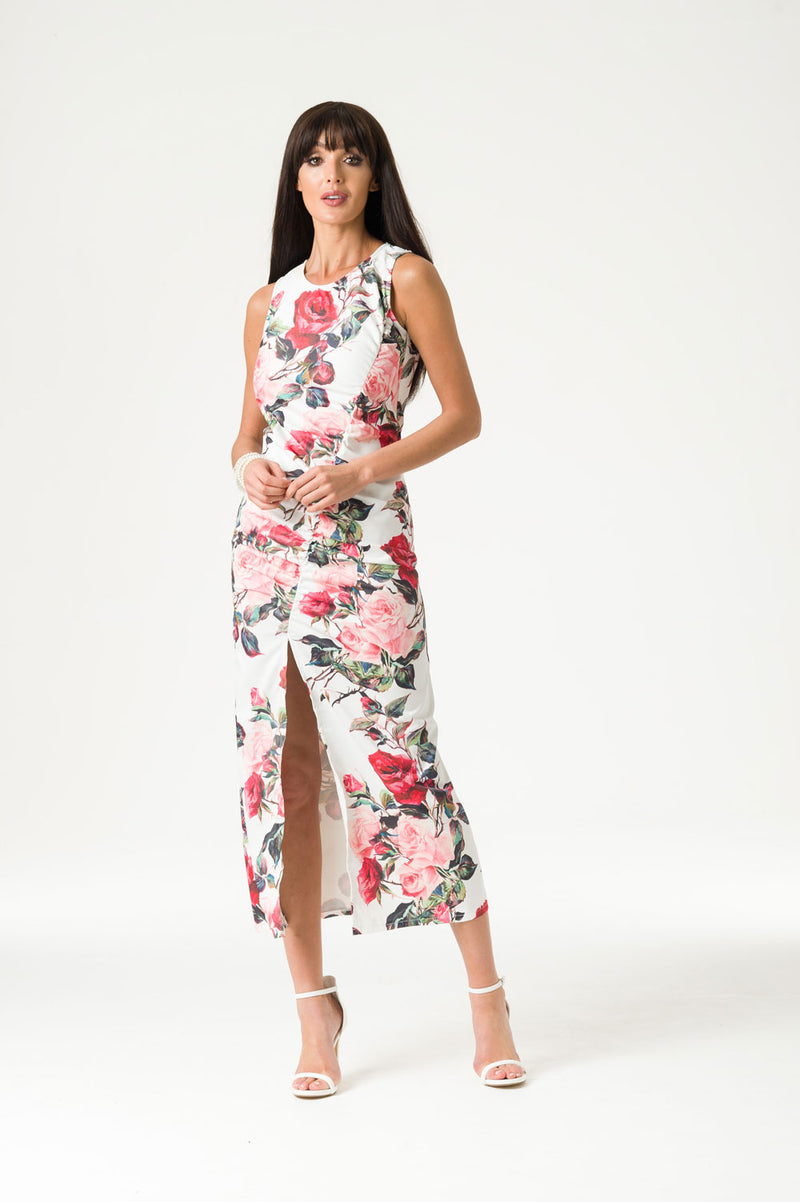 Our white maxi dress is printed with stunning roses in full bloom. Deep blushing fuscia and rouge weave around delicate lemonade pinks and ivy greens. Gentle asymmetric gathering down the front of the dress elegantly outlines the shape of the body, meeting a sophisticated leg split mid-thigh. We may have fashioned a rose print - but in this dress, you are the real rose.
