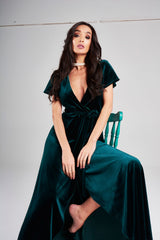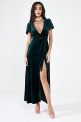 Richly indulgent in deep ivy green and a hushed velvet feel, this wrap dress oozes seductive sophistication. With a plunging neckline and smooth leg slit your everyday wonder woman is channelled into an outfit fit for a goddess. Like an enticing medusa, those who look may not turn to stone, but they will likely be stunned into motionless awe.