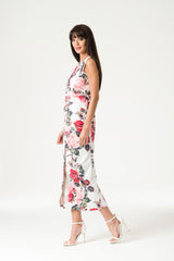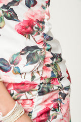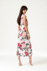 Our white maxi dress is printed with stunning roses in full bloom. Deep blushing fuscia and rouge weave around delicate lemonade pinks and ivy greens. Gentle asymmetric gathering down the front of the dress elegantly outlines the shape of the body, meeting a sophisticated leg split mid-thigh. We may have fashioned a rose print - but in this dress, you are the real rose.
