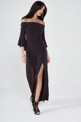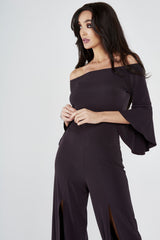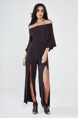 Let’s start at the top. The off-the-shoulder design immediately offers a sophisticated and flattering line which is complimented by a three quarter flared-from-the-elbow sleeve design. A mid waist trouser cut and deep leg split cleverly create an elongated leg whilst bringing the perfect cocktail of comfort, seduction, and sumptuous style. Pair with simple jewellery and your favourite heels and you are good to go!