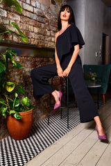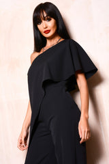 This Black One Shoulder Frill jumpsuit slides over the body for your fill of luxurious design. The black jumpsuit is all at once cool and contemporary offering decisive drama and seductive power to whomever wears it. Beautiful folds fall from the shoulder right down to the floor giving sophistication and elegance.